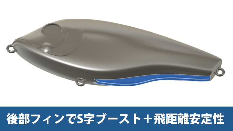 ベスパーワイルドのテールの後部にはフィンがあります。これはウォブリング(左右のお尻の振り)を抑制し、そのパワーをボディー全体に集約し、S字の動きに特化させています。これは「細かい動きが良い」のか「ダイナミックな大きい動き」がいいのか、という観点から完全に後者に軍配が上がる釣りも多いからです。またこのフィンはキャスト時の直進安定性に一役買っているので、空中でのルアーの回転を防ぎ、「真っすぐ飛ばす」=「よく飛ぶ」という事に寄与しました。