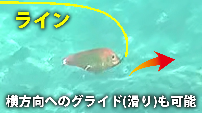 ジャークをすると平打ちでフラッシングが可能です。最後部のタングステンを外さないように優しくジャークした場合は横方向へグライド(滑り)しながらフォールしていきます。その時には滑る分のラインスラックは必要です。